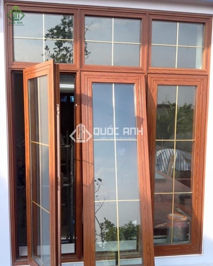 - Cửa nhôm Xingfa hệ 55 màu vân gỗ.