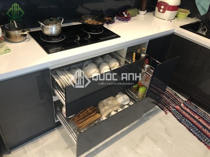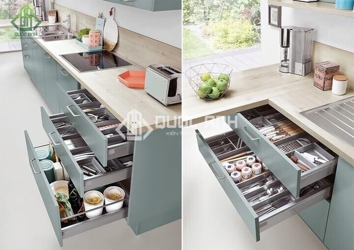 - Tủ bếp thông minh được thiết kế các ngăn hợp lý.